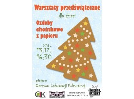 Centrum Informacji Kulturalnej w Sieradzu zaprasza jutro na przedświąteczne warsztaty dla dzieci. Spotkanie poprowadzi Kazimiera Balcerzak. Początek o 16:30. Udział w zajęciach jest bezpłatny.