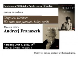 Mamy rok Zbigniewa Herberta i z tej okazji Powiatowa Biblioteka Publiczna w Sieradzu zaprasza jutro na kolejne spotkanie poświęcone poecie. O twórcy Pana Cogito opowie Andrzej Franaszek. Początek o godz. 18:00.