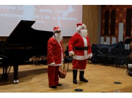 W czwartkowy wieczór w Sali Koncertowej PSM I st. w Sieradzu zgromadziły się dzieci wraz z najbliższymi, a na parking przed szkołą zajechały zaprzężone w renifery sanie Św. Mikołaja. Milusińscy, obdarowani słodyczami, przystąpili do rozwiązywania, jak przystało na szkołę muzyczną, zagadek dźwiękowych. O ile z rozpoznaniem głosów kota, konia czy krowy nie było problemu, o tyle głos kozy mógł być pomylony z głosem owieczki. Niełatwe do odgadnięcia okazały się dźwięki, które wydaje wiewiórka. Dzieci bezbłędnie natomiast rozpoznały głosy słonia, lwa czy wieloryba.