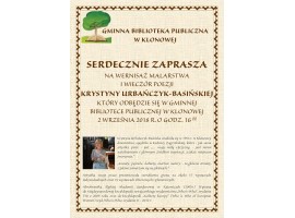 Gminna Biblioteka Publiczna w Klonowej zaprasza w najbliższą niedzielę na spotkanie autorskie z Krystyną Urbańczyk- Basińską. Artystka zaprezentuje swoje prace i odczyta fragmenty swojej poezji. Wystawę będzie można oglądać do 14 września.