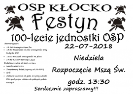 Ochotnicza Straż Pożarna w Kłocku zaprasza w niedzielę 22 lipca, na obchody 100- lecia powstania jednostki. W programie uroczystości m.in. przedstawienie rysu historycznego jednostki OSP oraz wręczenie medali i wyróżnień. Organizatorzy zapewniają też część nieoficjalną: festyn rodzinny, który zakończy zabawa pod chmurką.