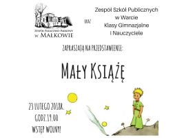 W piątek 23 lutego w pałacu w Małkowie będzie można obejrzeć "Małego Księcia". Sztukę na podstawie książki Antoine'a de Saint-Exupery'ego wystawią uczniowie z Warty. Początek o godz. 19:00.