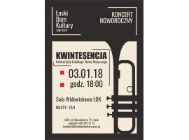 Łaski Dom Kultury zaprasza na Koncert Noworoczny w wykonaniu kwintetu dętego Łódzkiego Teatru Muzycznego "Kwintesencja". Koncert zaplanowano na środę, 3 stycznia.