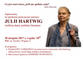 Powiatowa Biblioteka Publiczna w Sieradzu (ul. Żwirki i Wigury 4) zaprasza na spotkanie poświęcone pamięci Julii Hartwig. O wielkiej damie polskiej literatury i jej twórczości w środę 30 sierpnia opowie Ewa Jaśkiewicz. Początek o godz. 18:00,wstęp wolny.