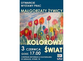 Gosia jest osobą "pozytywnie zakręconą", wesołą i towarzyską. Tak też przedstawia swój świat, w jasnych, pastelowych barwach. Jej obrazki są odzwierciedleniem tego ,co "jej w duszy gra". Będzie je można podziwiać w Centrum Informacji Kulturalnej w Sieradzu. Otwarcie wystawy w piątek ( 3 czerwca) o godz. 17:00, wstęp wolny.