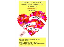 W wigilię św. Walentego młodzież z Publicznego Gimnazjum w Warcie przedstawiła w Warckim Centrum Kultury widowisko słowno-muzyczne pt. "Miłość w poezji i muzyce".