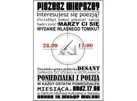 W najbliższy poniedziałek (28.09) w Centrum Informacji Kulturalnej w Sieradzu o godz.17:00 odbędzie się pierwsze, powakacyjne spotkanie Poniedziałków z poezją.