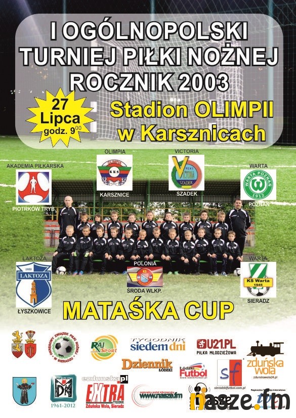 W turnieju MATAŚKA CUP weźmie udział osiem drużyn podzielonych na dwie grupy ,w których drużyny zagrają systemem każdy z każdym. Po fazie eliminacyjnej zostaną utworzone dwie nowe grupy. Dwa najlepsze zespoły z każdej grupy utworzą grupę mistrzowską. Udział w turnieju zapowiedziały: Olimpia Karsznice I, Olimpia Karsznice II, Warta Sieradz, Victoria Szadek , Polonia Środa Wielkopolska, Akademia Piłkarska Piotrków Trybunalski, Mazovia Tomaszów Mazowiecki, Laktoza Łyszkowice. Dla zwycięzców czekają puchary i nagrody (zespołowe i indywidualne), przewidziano również niespodizanki dla kibiców. Początek o godz. 9.00. Zapraszamy!