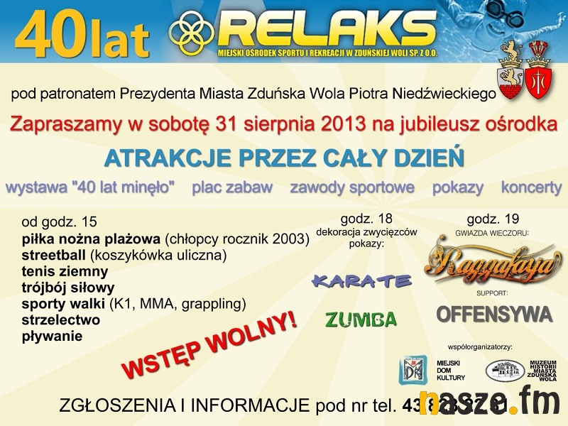 - Będą pokazy karate i zumby. O godzinie 19 zaczynamy część typowo artystyczną, czyli zespół Offensywa jako support czyli rozgrzewacz. O 20 główna gwiazda - zespół Raggafaya.