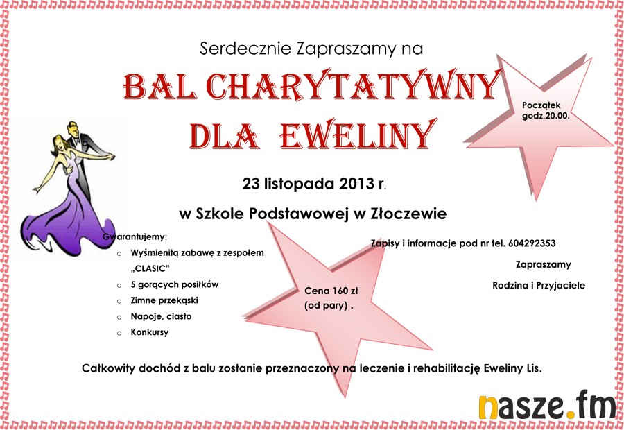 Rodzina i przyjaciele organizują w Złoczewie bal charytatywny. Impreza odbędzie się 23 listopada w Szkole Podstawowej w Złoczewie. Organizatorzy zapewniają dobrą zabawę z zespołem Clasic. Będą też konkursy z nagrodami i kilka ciepłych posiłków. Szczegóły na plakacie poniżej.