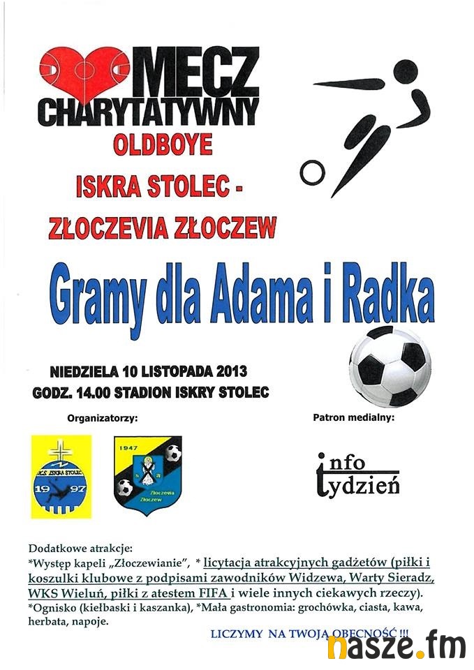 Piłkarze i działacze Iskry Stolec i Złoczevii postanowili pomóc w potrzebie swoim dwóm kolegom Adamowi Królewiczowi i Radosławowi Nawrockiemu, którzy zmagają się z ciężką chorobą. W niedzielę o 14.00 w Stolcu rozpocznie się mecz oldbojów Iskry i Złoczevii. Spotkaniu będzie towarzyszył festyn z udziałem kapeli Złoczewianie. W trakcie meczu i po nim będą licytowane koszulki piłkarskie m.in. Widzewa Łódź i Warty Sieradz (z podpisami zawodników), piłki z atestem FIFA i wiele innych. Na miejscu będą także stoiska gastronomiczne. Mieszkańcy Bieśca obiecali ugotować smaczną grochówkę. Wszystkich, którzy chcą wesprzeć Adama i Radka serdecznie zapraszamy do Stolca.