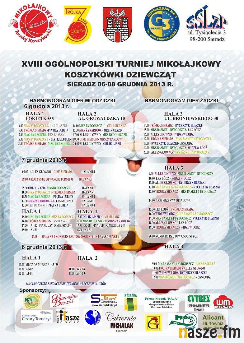 Już po raz 18. Uczniowski Klub Sportowy Trójka z Sieradza organizuje Turniej Mikołajkowy w koszykówce Dziewcząt. W tym roku 17 drużyn z całej Polski będzie grać przez trzy dni w trzech halach.