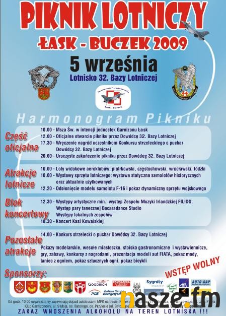 Oczywiście największą atrakcją będą najnowocześniejsze w Siłach Powietrznych RP wielozadaniowe samoloty bojowe F-16, stacjonujące w 32. Bazie Lotniczej. Organizatorzy przewidzieli także szereg innych atrakcji: koncert Kasi Kowalskiej, wystawy sprzętu lotniczego, uroczyste odsłonięcie modelu samolotu F-16, pokaz dynamiczny sprzętu wojskowego, konkurs strzelecki o puchar Dowódcy 32. Bazy Lotniczej oraz strzelanie do tarcz Łaskiego Bractwa Strzelców Kurkowych. Uczestnicy Pikniku będą mogli zobaczyć również występy artystyczne zespołów z zagranicy i zespołów lokalnych, a ponadto: pokazy modelarskie, wesołe miasteczko, stoiska gastronomiczne i wystawiennicze, gry, zabawy, konkursy z nagrodami, prezentacja modeli aut FIATA, BMW, VOLKSWAGENA i TOYOTY, pokaz mody, taniec z ogniem, pokaz sztucznych ogni oraz pokaz bicykli. Nie zabraknie również żołnierskiej grochówki oraz innych ciepłych posiłków. Wstęp wolny. Szczegółowe informacje pod numerem telefonu (043) 67 70 601 lub (043) 67 70 447.
