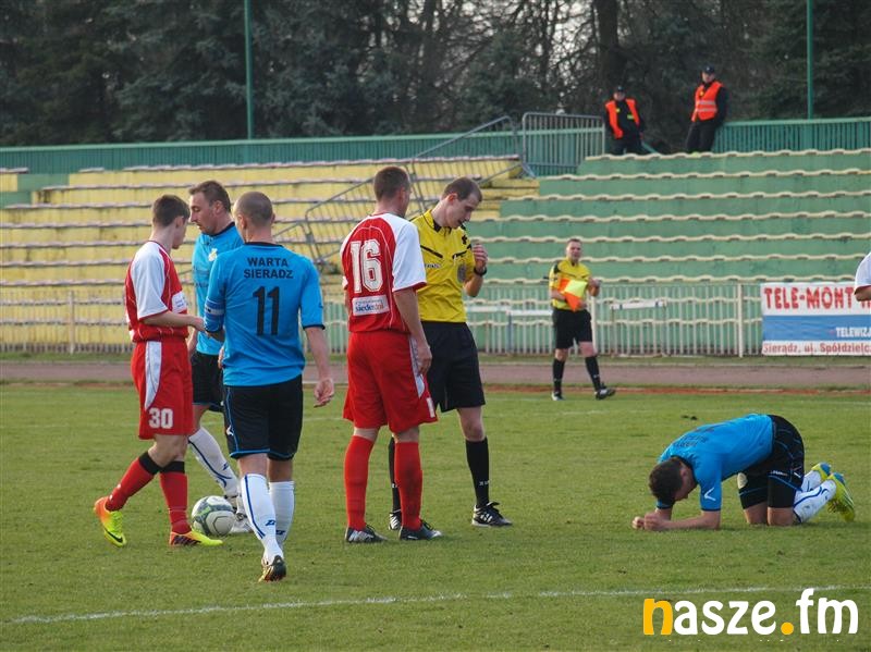 Piłkarze często przywiązują wagę do przesądów, szczęście mogą przynosić np. stroje. Jeśli zawodnicy Broni mają swoje szczęśliwe koszulki, to na pewno nie pomogły im w dzisiejszym spotkaniu, bo...zostały w domu. Goście przyjechali do Sieradza bez własnych piłkarskich uniformów, ale na szczęście w magazynie Warty znalazł się komplet strojów, które wypożyczono piłkarzom z Radomia. Mecz świetnie rozpoczęli gospodarze, którzy już w 6. minucie zdobyli prowadzenie po strzale głową Michała Stasiaka po rzucie rożnym. Kilka minut później świetną okazję miał Kamil Woźniak, ale z kilku metrów strzelił głową wprost w bramkarza. W miarę upływu czasu do głosu zaczęli dochodzić goście, którzy kilkakrotnie zagrozili bramce Warty, na posterunku był jednak Kamil Adamek. Początek drugiej połowy to znów bramka dla Warty. Tym razem ładną akcję Michała Bogdana zakończył mierzonym strzałem z 16. metrów Przemek Różycki. Kiedy wydawało się, że gospodarze przejmą kontrolę nad meczem, do ataku ruszyli goście. Już w 50. minucie bramkę kontaktową strzelił Piotr Nowosielski, a w 60. minucie Mariusz Marczak uzyskał wyrównanie. W tym fragmencie gry Warta dała się zepchnąć rywalowi do defensywy, ale w końcówce znów ruszyła do przodu. Gorąco zrobiło się po faulu na Różyckim, kiedy rzut wolny wykonywał Łukasz Mitek. Jego strzał z 18. metrów zatrzymał ręką Wicik, za co ujrzał żółtą kartkę. Wprawdzie zawodnicy Warty twierdzili, że mur stał już w polu karnym, ale zdjęcie wyjaśnia wątpliwości.