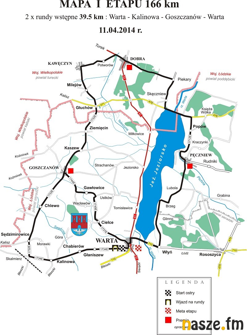 Kolarze (elita i orlicy) będą mieli do pokonania w sumie 493 km. Pierwszy etap wokół Warty liczy sobie 168 km. W sobotę kolumna wyścigu przeniesie się do Opatówka, gdzie rozegrana zostanie 14. km czasówka, po południu etap o długości 148 km z Kalisza do Kazimierza Biskupiego. Wyścig zakończy się w niedzielę, a start do ostatniego etapu (163 km z metą w Kaliszu) nastąpi w Błaszkach.