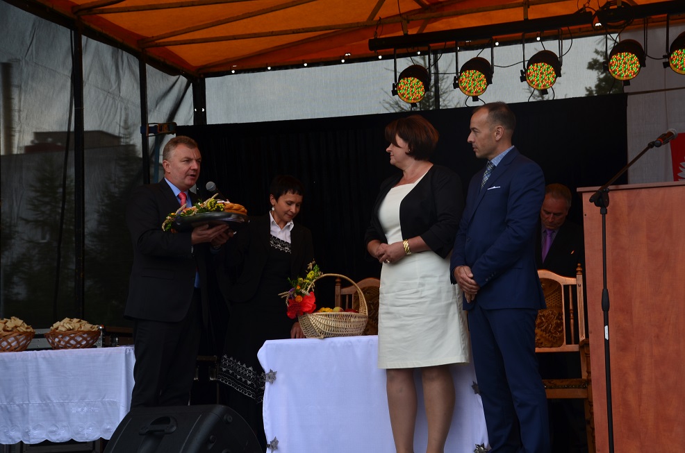 Nie zabrakło tradycyjnych symboli. Starostowie wręczyli na scenie burmistrzowi Piotrowi Świderskiemu chleb dożynkowy.