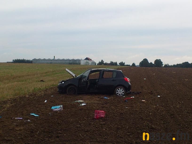 Kobieta kierująca renault zjechała z jezdni na lewą stronę i wjechała do przydrożnego rowu. Auto dachowało, po czym zatrzymało się kilkanaście metrów dalej na polu uprawnym. Kierująca pojazdem miała na szczęście zapięte pasy. W wyniku zdarzenia nie odniosła poważniejszych obrażeń, choć z pewnością najadła się strachu. Pomocy udzielili jej strażacy, a potem wezwani na miejsce ratownicy medyczni.