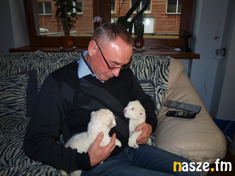 Małe lwiątka niczym prawdziwe oswojone kociaki zamieszkały w salonie właścicieli zoo w Borysewie.