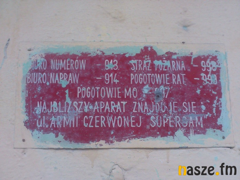 Czerwona tabliczka z białym napisem nadal informuje, że na przykład numer alarmowy do pogotowia MO (Milicji Obywatelskiej) to 997. Najbliższy aparat telefoniczny jest zaś przy ul. Armii Czerwonej obok supersamu. Dziś to ul. Jana Pawła II. Jeśli gdzieś obok Was są jeszcze takie pamiątki po poprzedniej epoce to nadsyłajcie je nam na adres: kontakt@nasze.fm. Opublikujemy je, oczywiście na życzenie autora zdjęcia, z imieniem i nazwiskiem.