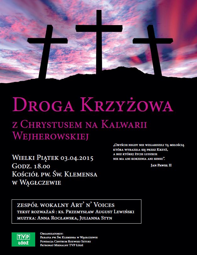 Dzień koncertu nie jest przypadkowy (Wielki Piątek), bowiem zaprezentowany zostanie unikatowy, jedyny w Polsce projekt - "Droga Krzyżowa. Z Chrystusem na Kalwarii Wejherowskiej". W kościele pw. św. Klemensa w Wągłczewie wystąpi zespół wokalny Art'n'Voices. Początek koncertu o godz.18:00.