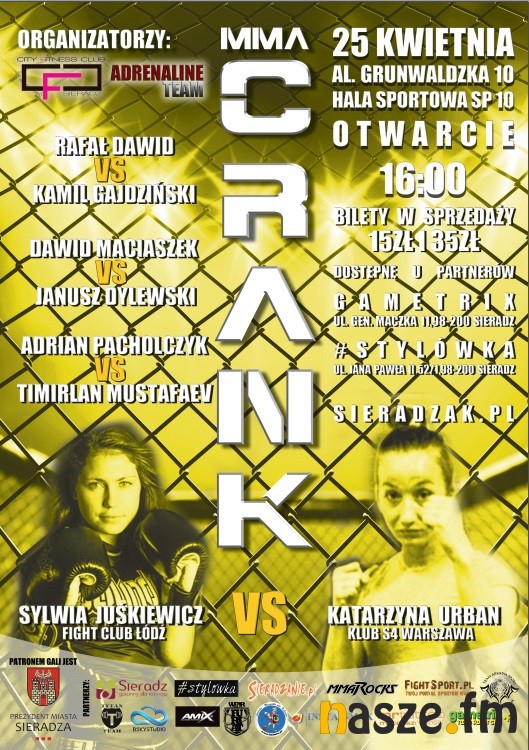 W programie gali znalazły się walki amatorskie i zawodowe. Walką wieczoru będzie pojedynek...pań. W oktagonie rękawice skrzyżują: Katarzyna Urban (S4 Warszawa) i Sylwia Juśkiewicz (Fight Club Łódź). Obydwie zawodniczki mogą się pochwalić niemałymi sukcesami. Sylwia Juśkiewicz uznana była za najlepszą zawodniczkę Kickboxingu w roku 2014 w ramach Fight Sport Awards. W 2012 roku mając 17 lat stoczyła pierwszą walkę w MMA z debiutującą wówczas także w tej formule Joanną Jędrzejczyk - aktualną mistrzynią UFC. Walczyła w Czechach, Szwecji i Finlandii tocząc świetne zacięte pojedynki. Teraz postanowiła wrócić do MMA. W ubiegłym roku wygrała dwie walki w kickboxingu w ramach organizacji FEN, pokonała m.in. mistrzynię świata Lenę Ovchynnikovą z Ukrainy. Katarzyna Urban to 27. letnia podopieczna trenera Roberta Jocza. Jest bardzo waleczna i utalentowana, ale na koncie ma tylko jeden pojedynek z bardzo doświadczoną Barbarą Nalepką. Warszawianka przegrała ten pojedynek, ale już w pierwszej akcji potrafiła posłać rywalkę na deski. Zabrakło jej doświadczenia, którego będzie szukać właśnie w takich starciach jak to w Sieradzu. Urban jest z wykształcenia matematykiem co pokazuje, że bardzo inteligentne kobiety także chcą walczyć w MMA. Ponadto w hali Szkoły Podstawowej nr 10 w Sieradzu zaprezentuje się miejscowa gwiazda sztuk walki, Rafał Dawid. Zawodnik walczy już 10 lat, w różnych formułach (K1, Muai Thai, boks), jest aktualnym Mistrzem Polski Wojska Polskiego w MMA, w tym roku wygrał również zawodową walkę podczas meczu MMA Anglia - Polska. Na ringach zawodowych Rafał legitymuje się rekordem 4:1. Przeciwnikiem Rafała Dawida podczas sobotniej gali będzie Kamil Gajdziński z Łodzi. Oprócz samych walk podczas gali odbędą się także licytacje sportowych gadżetów (m.in. rękawice z podpisem Mameda Chalidowa). Jest jeszcze możliwość przekazania ciekawych gadżetów na licytacje, osoba, która to zrobi dostanie od organizatorów bilet przy samym oktagonie. Bilety w cenie 15 i 35 zł będzie można kupić w dniu zawodów przy wejściu do hali. Początek gali o 16:00. Więcej na temat sobotniej gali przeczytacie TUTAJ