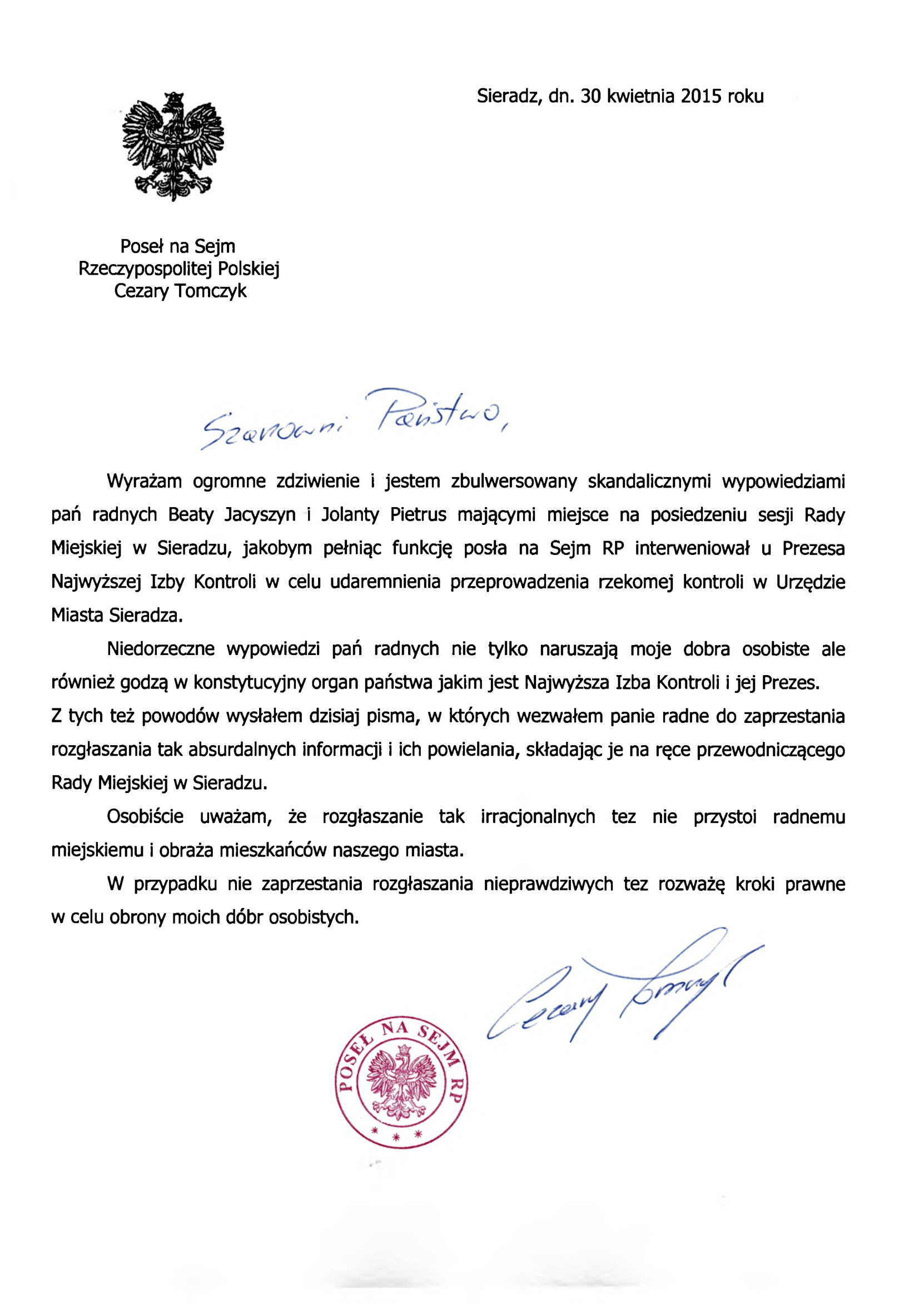 Poniżej prezentujemy oficjalne pismo, które otrzymaliśmy od Cezarego Tomczyka w tej sprawie: