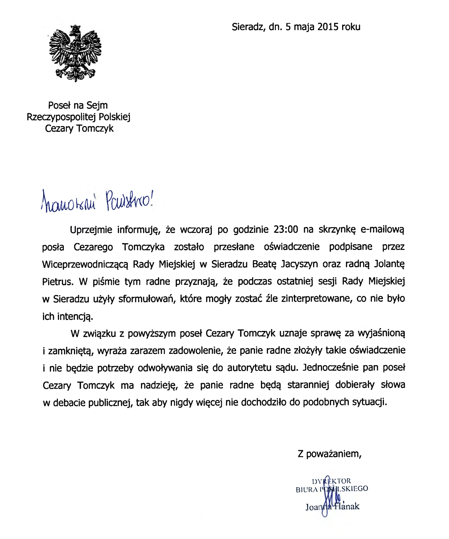 Poseł Cezary Tomczyk jednak nie złoży pozwu za słowa radnych dot. niedoszłej kontroli NIK. Wiceprzewodnicząca Beata Jacyszyn i radna Jolanta Pietrus sprostowały swoje słowa w oficjalnym piśmie.