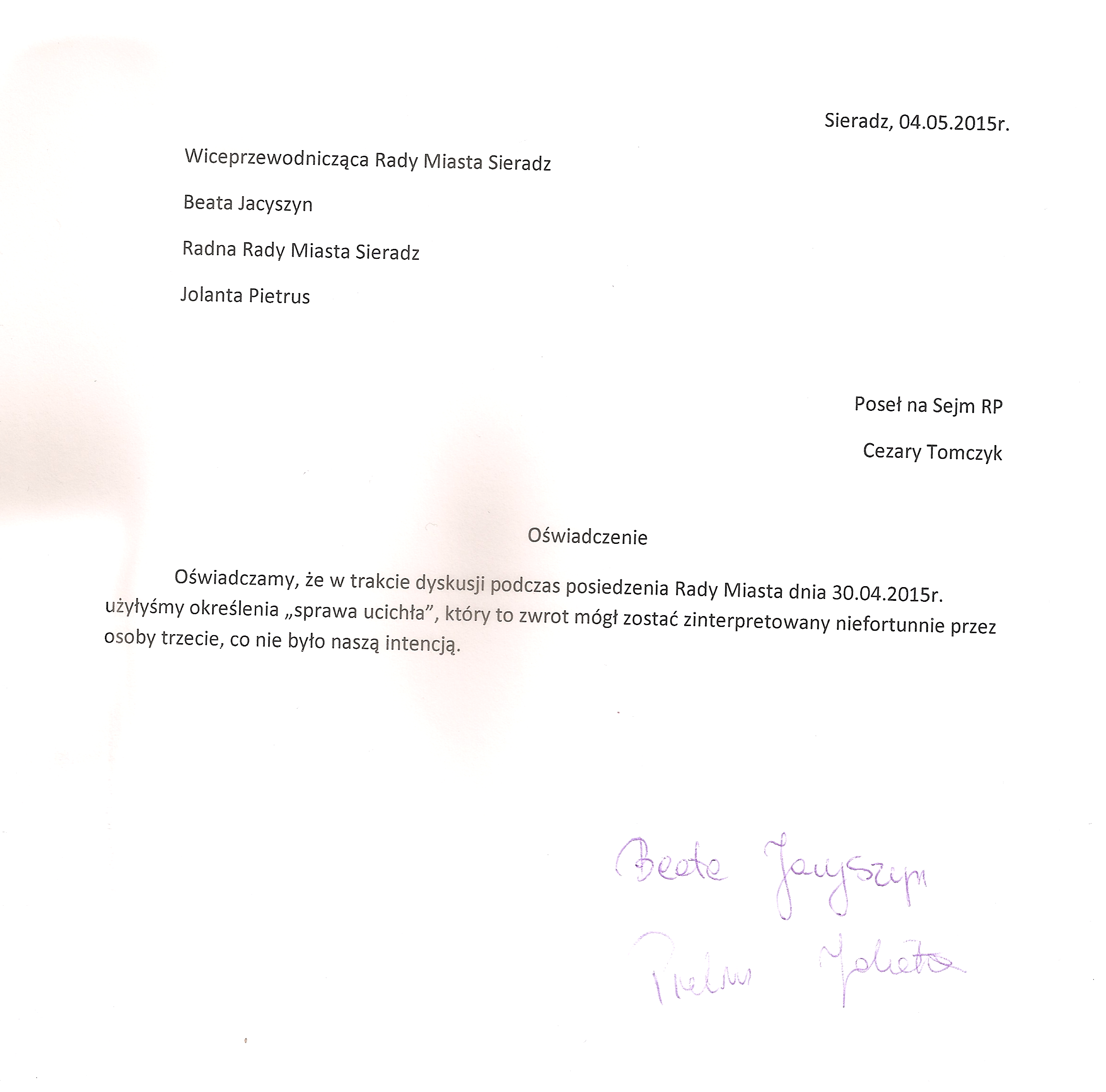 Jak się okazuje, radne sprostowały swoje słowa. Jak uznały sformułowanie "sprawa ucichła", mogło zostać niefortunnie zinterpretowane przez osoby trzecie, co nie było intencją radnych. Poniżej prezentujemy oświadczenie radnych, jak i samego posła.