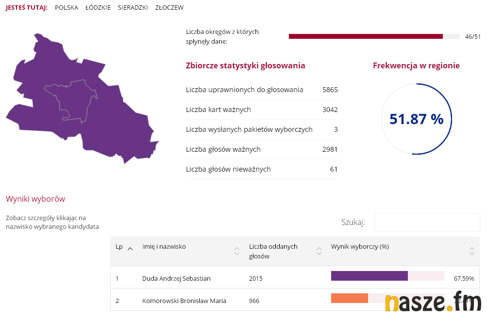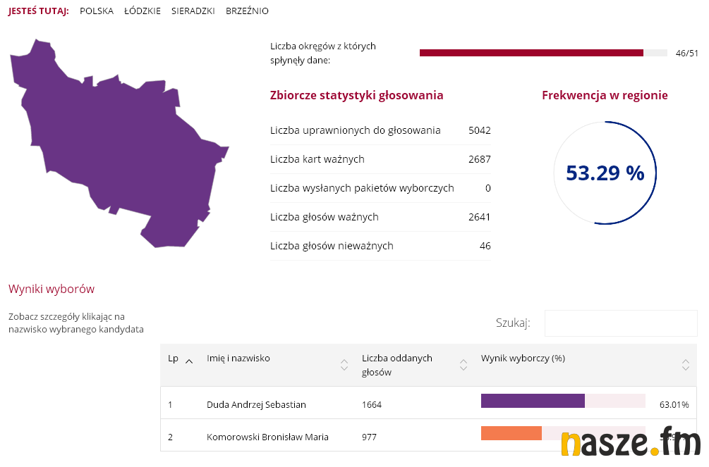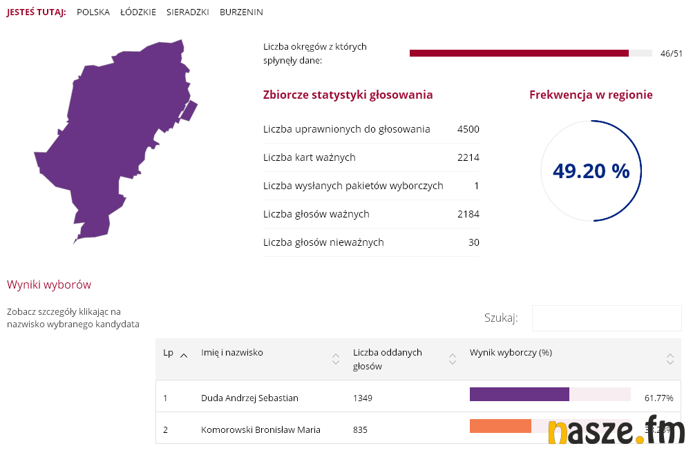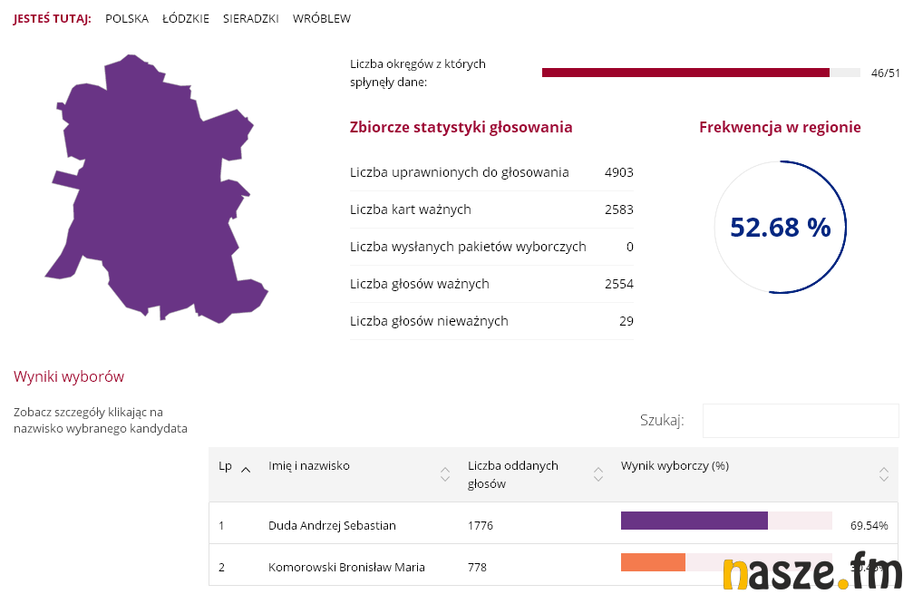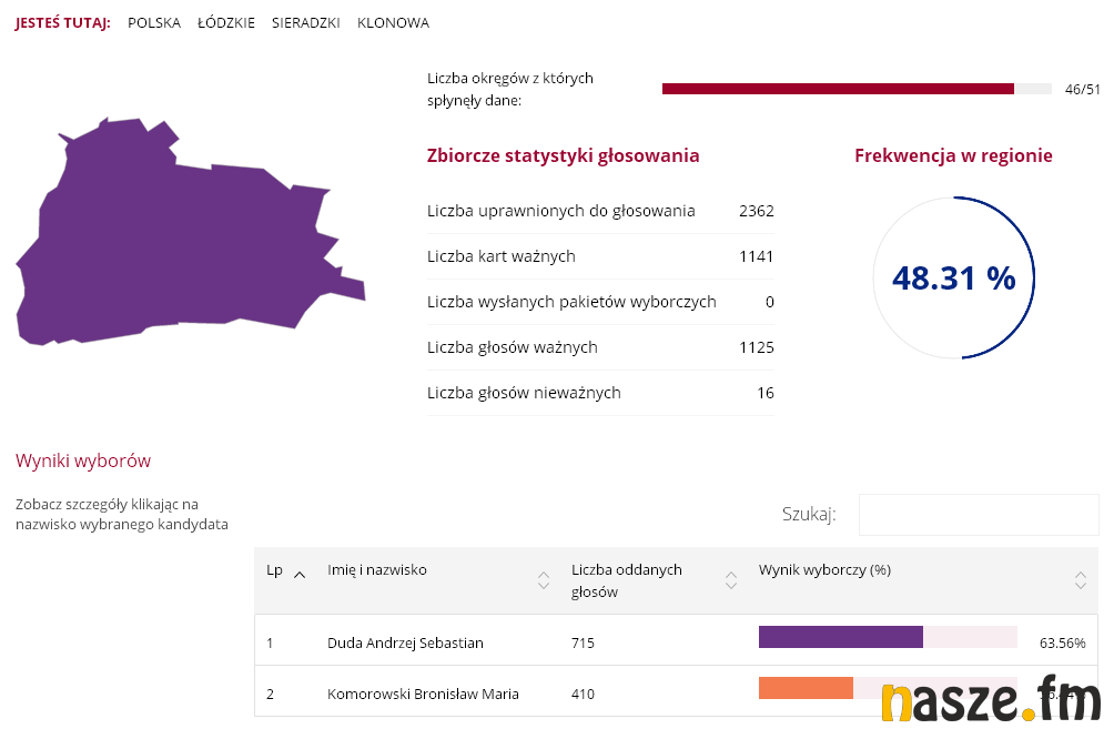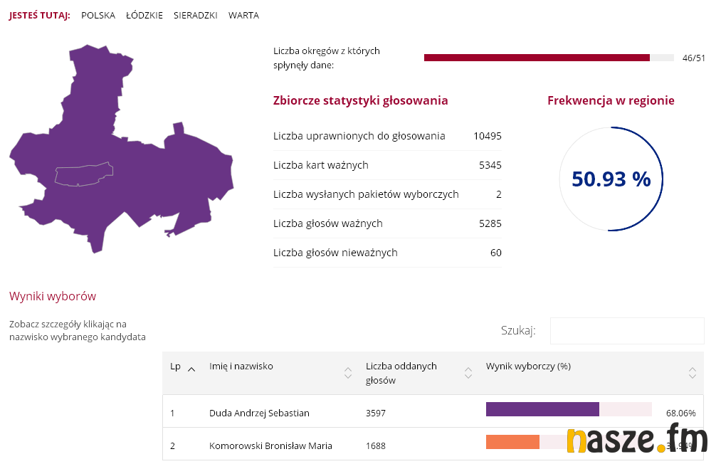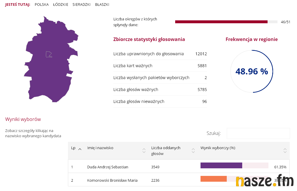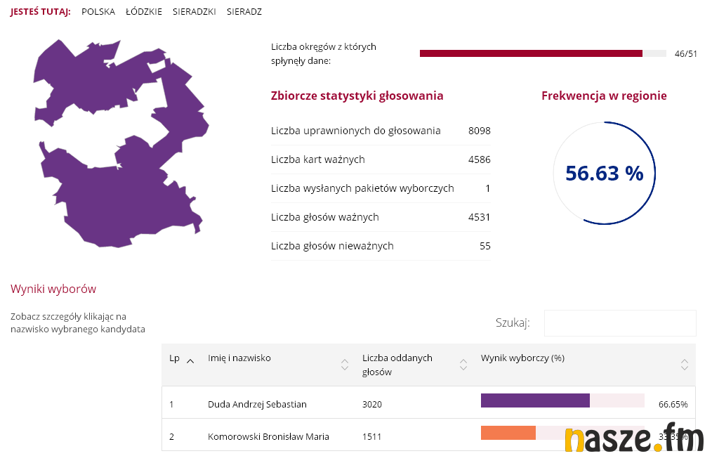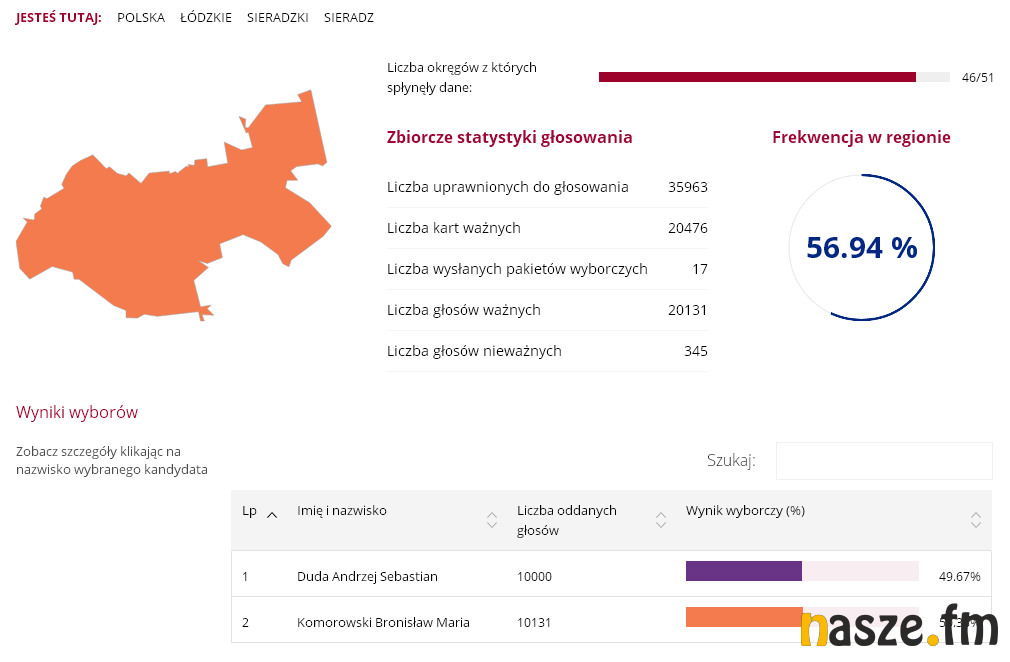51,55 proc. - tyle zdobył Andrzej Duda wg oficjalnych wyników podanych przez PKW. Jego konkurent w II turze, Bronisław Komorowski, zdobył 48,45 proc. W Sieradzu wynik rozłożył się następująco: 49,67 proc. do 50,33 proc. na korzyść Komorowskiego.