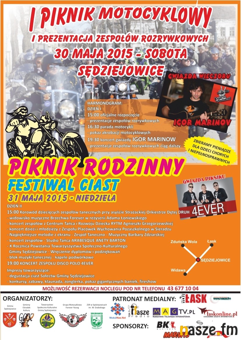 W sobotę (30.05) w Sędziejowicach odbędzie się I Piknik Motocyklowy połączony z prezentacją zespołów rozrywkowych. Natomiast na niedzielę (31.05) zaplanowano Piknik Rodzinny i Festiwal Ciast.