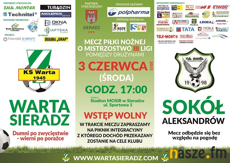 Wstęp za darmo, piknik z grillem i oczywiście piłkarskie emocje - to propozycja dla kibiców na środowe popołudnie. Zarząd Warty Sieradz chce w ten sposób pożegnać się z sezonem 2014/2015, dziękując piłkarzom, trenerowi i kibicom. Wprawdzie do zakończenia rozgrywek pozostały dwie kolejki, ale Warta na boisko wybiegnie tylko raz, bo za mecz z Targówkiem otrzyma walkower. W najgorszym razie biało-zieloni zakończą ten sezon z dorobkiem 50. punktów, a w przypadku zwycięstwa lub remisu z Sokołem może być jeszcze lepiej. Miejmy nadzieję, że sieradzanie podtrzymają passę spotkań bez porażki, która trwa od 2 maja (4 zwycięstwa, 2 remisy). Początek środowego pojedynku o 17:00, tradycyjnie wszystkich chętnych na stadion przywiezie darmowy autobus (odjazd z ul. Sadowej o 16:15). Całkowity dochód ze sprzedaży ciepłych przekąsek i zimnych napojów zostanie przeznaczony na cele statutowe klubu.