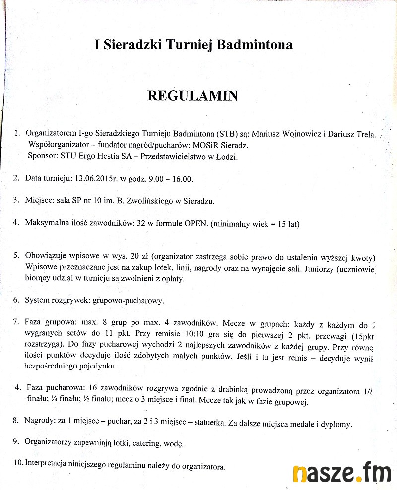 To pierwszy tego typu turniej w Sieradzu, adresowany jest do typowych amatorów, nie trenujących badmintona w klubach. Zawody zostaną rozegrane w kategorii Open, ilość miejsc w turniejowej drabince jest ograniczona (32). Zostało jeszcze kilka wolnych miejsc, jednak organizatorzy nie wykluczają powiększenia liczby zawodników, w przypadku większej ilości chętnych. Zapisy przyjmuje organizator zawodów - Mariusz Wojnowicz, tel. 601 802 412. Turniej odbędzie się w hali Szkoły Podstawowej nr 10 w Sieradzu, początek o 9:00.