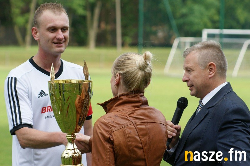 Jak przystało na lidera zawodnicy gospodarzy tym faktem się nie załamali i już w 28 minucie Grzegorz Królewiak strzelił gola drużynie przyjezdnej. W drugiej połowie swoją klasę pokazał Dawid Kępniak który to strzelił dwie bramki, w tym jedną z rzutu karnego a bramkarz gości ujrzał czerwony kartonik i opuścił boisko. Nadmienić trzeba, że to był 35 gol Kępniaka w sezonie 2014/15. W końcówce meczu czwartego gola dla gospodarzy zdobył Filip Jaszczak, utalentowany junior MKSu. Między słupkami bramki stanął doświadczony bramkarz Konrad Kulma, wychowanek MKSu. Po rozegranym meczu starosta zduńskowolski Wojciech Rychlik wręczył drużynie puchar i okolicznościowe statuetki za awans do V ligi.