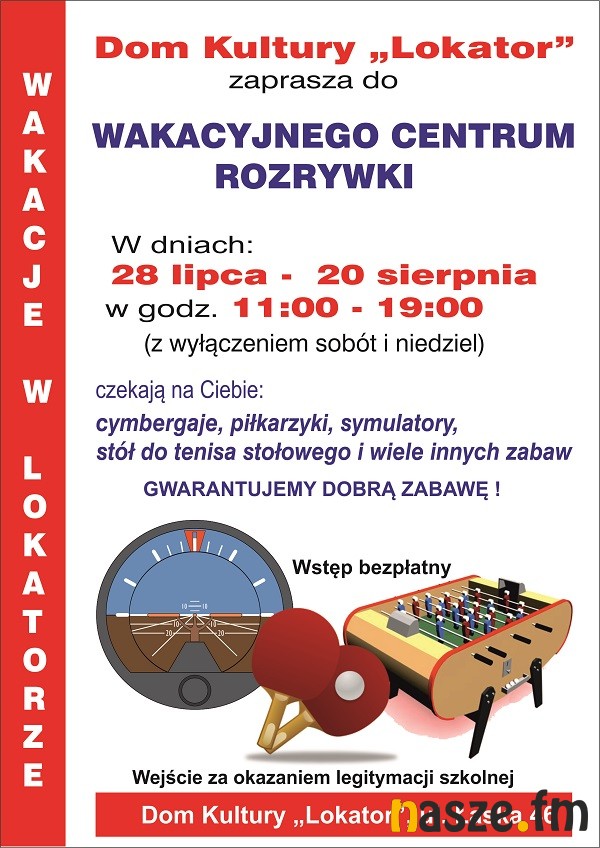 Dom Kultury "Lokator" w Wakacyjne Centrum Rozrywki zamieni się od 28 lipca, a z przygotowanych atrakcji będzie można korzystać codziennie aż do 20 sierpnia, w godzinach od 11 do 19. Jedynym warunkiem uczestnistwa w zajęciach jest posiadanie legitymacji szkolnej. Nie trzeba się wcześniej zapisywać.