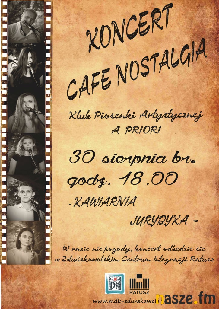 Klub Piosenki Artystycznej "A Priori" działający w Miejskim Domu Kultury w Zduńskiej Woli zaprasza na kolejny koncert z cyklu "Cafe Nostalgia". Koncert odbędzie się w najbliższą niedzielę (30.08) w Kawiarni Jurydyka.