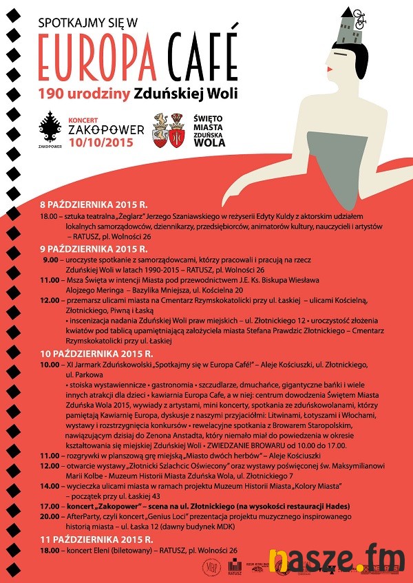 - kawiarnia Europa Cafe, a w niej: centrum dowodzenia Świętem Miasta Zduńska Wola 2015, wywiady z artystami, mini koncerty, spotkania ze zduńskowolanami, którzy pamiętają Kawiarnię Europa, dyskusje z naszymi przyjaciółmi: Litwinami, Łotyszami i Włochami, wystawy i rozstrzygnięcia konkursów,