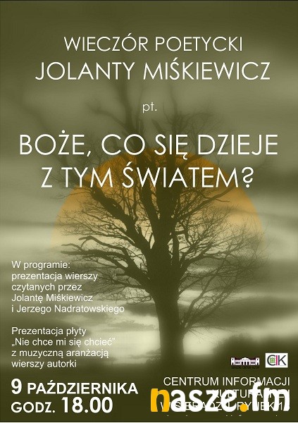 Podczas dzisiejszego spotkania zaprezentowane zostaną wiersze czytane przez autorkę oraz Jerzego Nadratowskiego. Będzie można także posłuchać płyty z muzyczną aranżacją utworów Jolanty Miśkiewicz.