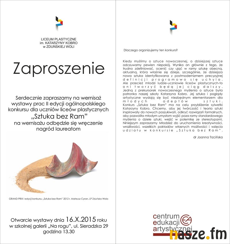 W najbliższy piątek odbędzie się wernisaż wystawy prac II Ogólnopolskiego Konkursu dla Uczniów Liceów Plastycznych "Sztuka bez Ram". Jurorzy, którzy oceniali prace to profesorowie akademii sztuk pięknych w Łodzi, Warszawie i Krakowie.