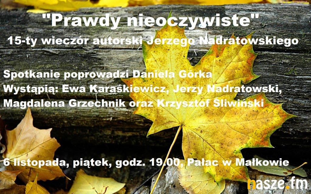 Spotkanie poetyckie zaplanowane na dzisiejszy wieczór w Małkowie jest zatytułowane "Prawdy nieoczywiste". Będzie to już piętnasty wieczór autorski Jerzego Nadratowskiego. Początek o godz. 19:00,.