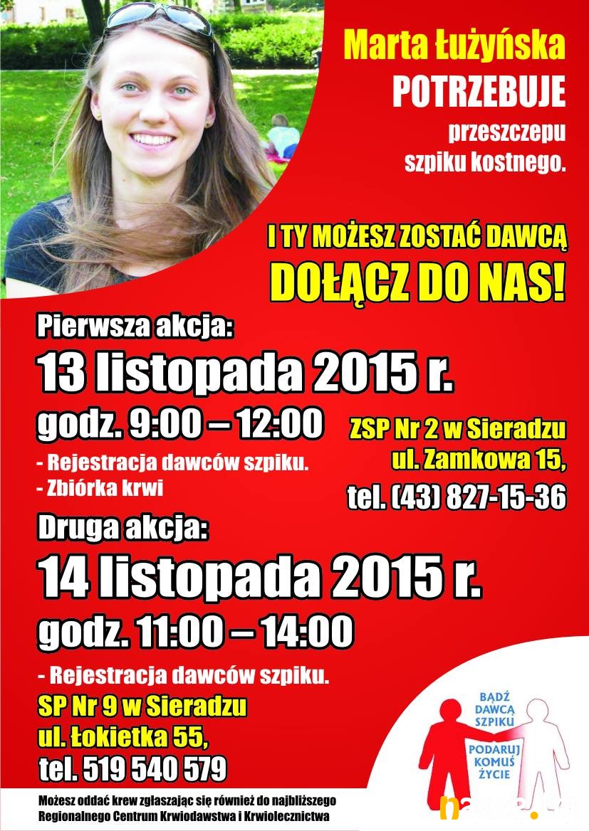 Sieradzanka, Marta Łużyńska, zapadła na poważną i rzadką chorobę układu krwiotwórczego. Jedynym ratunkiem jest dawca szpiku kostnego. Dlatego w Sieradzu są organizowane dwie akcje, gdzie odbędą się zbiórki krwi połączone z zapisami do banku szpiku.