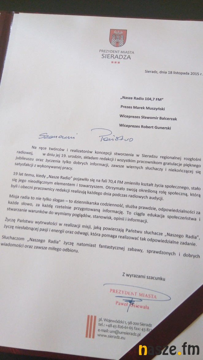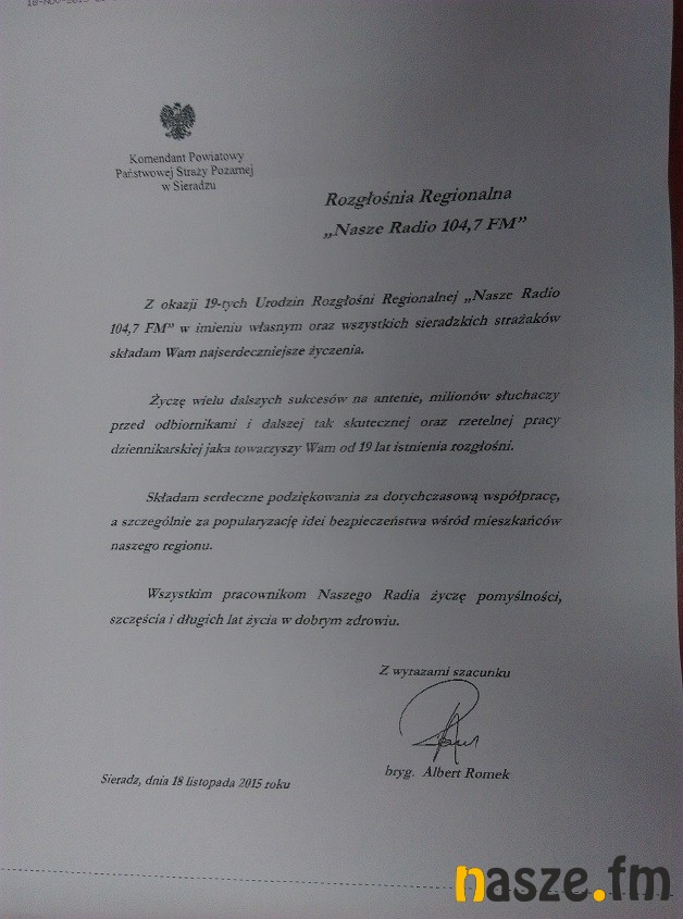 Jak co roku nie zapominają o nas nasi wierni Słuchacze. Serdecznie dziękujemy za urodzinowe życzenia, które otrzymujemy. Jeszcze wczoraj przepiękną laurkę dostaliśmy od dyrekcji, pracowników i dzieci z Przedszkola nr 3 w Sieradzu. Dziś życzenia wszelkiej pomyślności otrzymaliśmy od bryg. Alberta Romka, komendanta powiatowego Państwowej Straży Pożarnej w Sieradzu, który przekazał je w imieniu wszystkich funkcjonariuszy i pracowników.