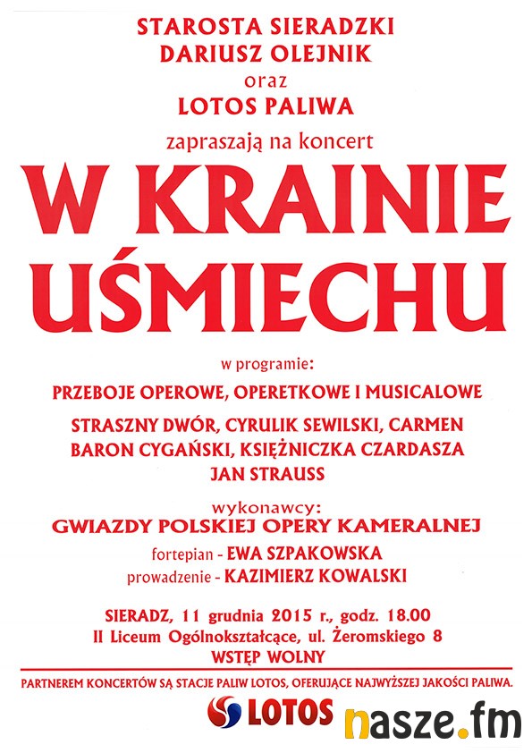 - Pragnę wszystkich mieszkańców powiatu sieradzkiego i mieszkańców Sieradza zaprosić na koncert "W krainie uśmiechu" - mówi Dariusz Olejnik, starosta sieradzki - Koncert przygotowany jest przez artystów łódzkich, są to gwiazdy polskiej opery kameralnej. Myślę, że każdy kto przyjdzie na ten koncert, wychodząc, przed tymi świętami, będzie wysoce uduchowiony, bo muzyka jest przepiękna.