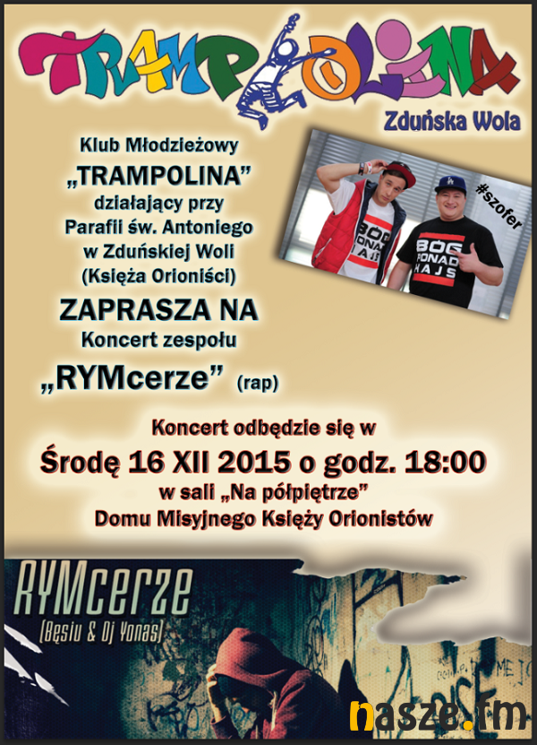 Bęsiu i Dj Yonas tworzący formację RYMcerze ponownie odwiedzą Zduńska Wolę, by wskazać młodym ludziom drogę lepszego życia. Tym razem wystąpią w klubie młodzieżowym Trampolina, który działa w Domu Misyjnym Księży Orionistów.
