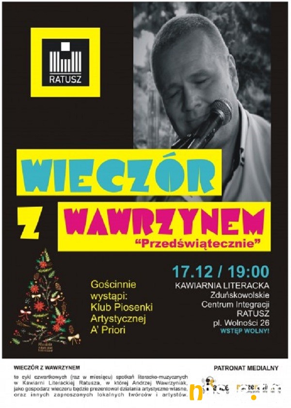 "Przedświątecznie" taki tytuł nosi kolejna, ostatnia już w tym roku, odsłona "Wieczoru z Wawrzynem", który w najbliższy czwartek odbędzie się w zduńskowolskim ratuszu. Wieczory to organizowane raz w miesiącu spotkania literacko-muzyczne, których gospodarzem jest zduńskowolski muzyk Andrzej Wawrzyniak.