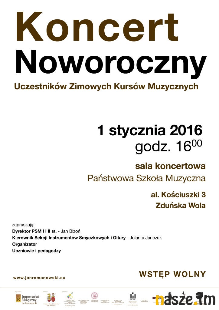 Impresariat Muzyczny Jana Romanowskiego oraz Państwowa Szkoła Muzyczna w Zduńskiej Woli zapraszają na "Koncert Noworoczny", który jutro (0101) odbędzie się w sali koncertowej szkoły przy al. Kościuszki.