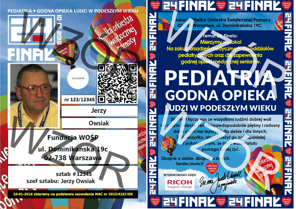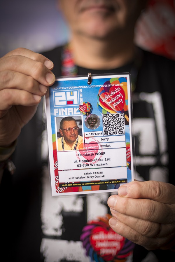Na identyfikatorze znajduje się imię, nazwisko oraz zdjęcie wolontariusza, numer zbiórki, hologram potwierdzający oryginalność identyfikatora oraz kod QR.