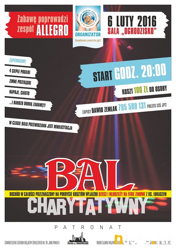 Zduńskowolskie Stowarzyszenie Centrum Inicjatyw Społecznych im. Jana Pawła II organizuje Bal Charytatywno-Karnawałowy. Chodzi w nim o to, by oprócz dobrej zabawy zebrać pieniądze na wyjazd dzieci i młodzieży na zimowisko.