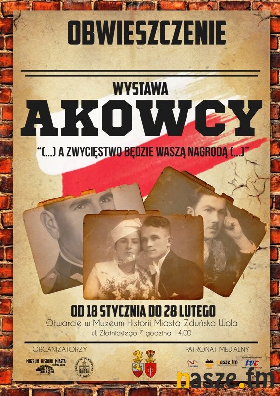 W najbliższy poniedziałek (18.01) w siedzibie zduńskowolskiego muzeum otwarta zostanie wystawa "AKOWCY - (...) a zwycięstwo będzie Waszą nagrodą (...)". Organizatorami wydarzenia są: Muzeum Historii Miasta Zduńska Wola oraz sieradzki oddział Archiwum Państwowego w Łodzi.