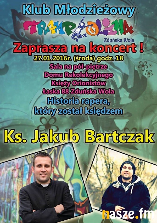 Klub Młodzieżowy "Trampolina" i Parafia św. Antoniego w Zduńskiej Woli zapraszają wszystkich fanów hip-hopu na niecodzienny koncert. Tym razem wystąpi Jakub Bartczak - rapujący ksiądz.