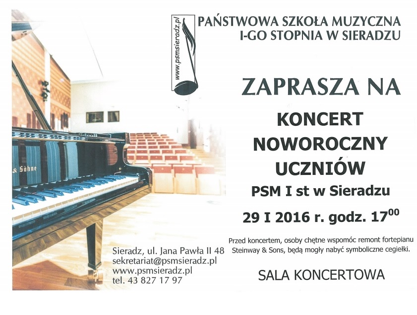 Wstęp na koncert jest wolny. Szkoła, dziękując darczyńcom za już przekazane pieniądze na remont wyjątkowego fortepianu, który zakupiła latem minionego roku, informuje, że także podczas tego koncertu będą zbierane datki na ten cel.